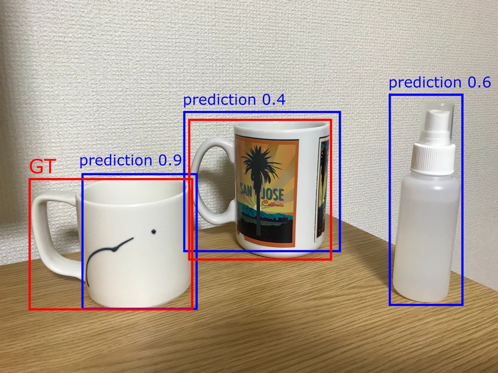 コップの検出結果。 例として、スコアのしきい値を0.5に設定したとする。 右のスプレーボトルは、コップではないのにコップとして推論してしまっているために誤検出(False Positive)になる。 真ん中のコップは、推論結果(青枠)のスコアが低いために未検出(False Negative)になる。 左のコップは、正解(赤枠)との重なりが小さめである。IoUがしきい値以上の場合はTrue Positiveになり、IoUがしきい値以下の場合にはFalse NegativeかつFalse Positiveになる。