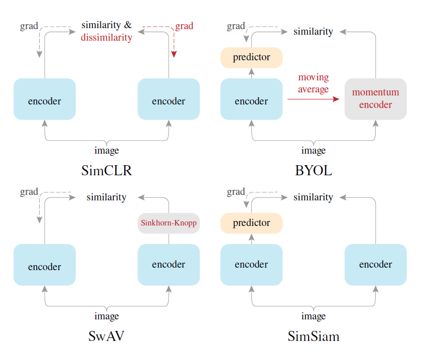 CLが流行する以前の自己教師あり学習は、画像を等分し並べ替えるようなタスクや、出力特徴量のクラスタリングとクラスタへの分類を交互に解くようなタスク等、様々な手法が模索されていました。CLは既存の他の手法に大きく勝る精度を残した事で、2020年から大流行しました("Pretext Task"の列が"discrimination"の手法)。2022年はTransformer専用のマスク部分再構成の手法("Pretext Task"の列が"reconstruction"の手法、MAE[4]等)が開発され、発展をしています。